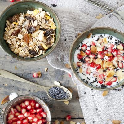 Doe de yoghurt in een kommetje en meng er alle zaden en fruit doorheen. Leg nog wat fruit bovenop als versiering.